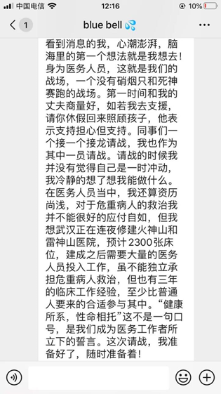 她說(shuō):一方有難,八方支援,身為一個(gè)醫(yī)務(wù)人員的我,愿意沖在最前線,砥礪前行,武漢加油!我們與你同在!
