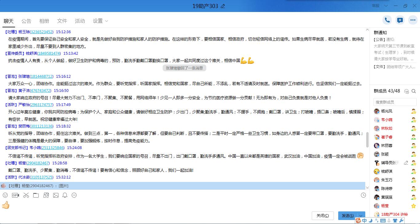 1月29日,護(hù)理系各黨支部以學(xué)習(xí)強(qiáng)國視頻會(huì)議的形式召開黨員大會(huì),護(hù)理系各班級(jí)以QQ群視頻會(huì)議、YY視頻會(huì)議等形式召開主題班會(huì),將習(xí)近平總書記關(guān)于當(dāng)前新型冠狀病毒感染肺炎疫情防控工作重要指示精神以及學(xué)院黨委中心組(擴(kuò)大)會(huì)議精神等傳達(dá)到每位師生。