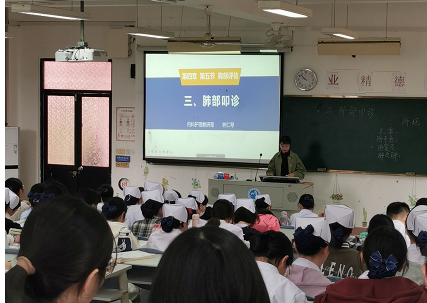 為踐行黨的二十大報告提出的建設(shè)高質(zhì)量教育體系和關(guān)注教師隊伍建設(shè),不斷提升青年教師教學(xué)水平,展示青年教師的自我風(fēng)采,護理學(xué)院內(nèi)科護理教研室教師林仁琴于4月6日上午開設(shè)了《健康評估》校級公開課,為22級護理專業(yè)學(xué)生講授“肺部叩診”內(nèi)容。學(xué)校質(zhì)量管理辦公室主任郭禮堅攜校級督導(dǎo)對該堂公開課進行評議、護理學(xué)院副院長林浩、王憲寧和各院系多位教師參與聽課。