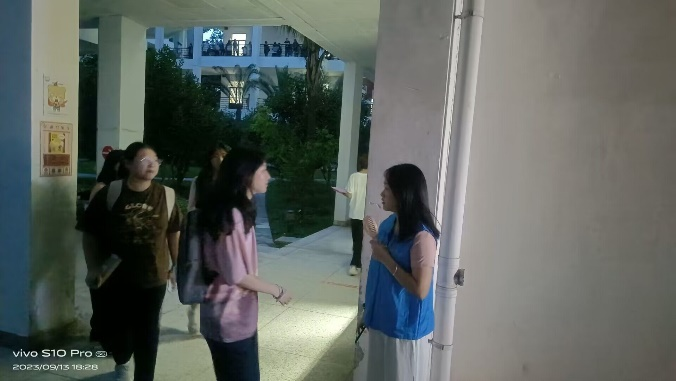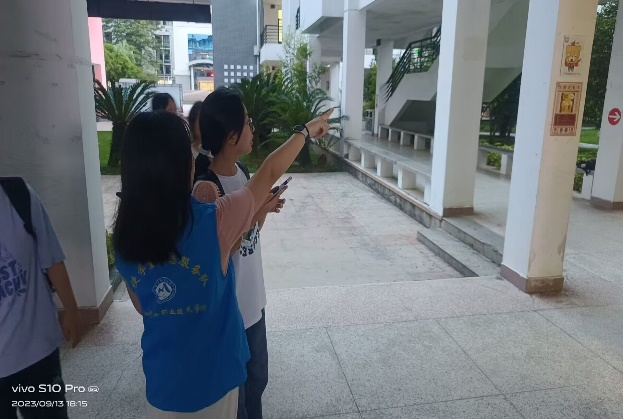 活動現(xiàn)場,教學樓樓下的各個角落,都有安排志愿者在等候。不久,陸續(xù)有一些新生來到教學樓。由于初次班會,新生們對教學樓排布并不明晰,他們詢問教室的位置,志愿者們熱情地為他們指引方向并告訴他們教室的具體位置。