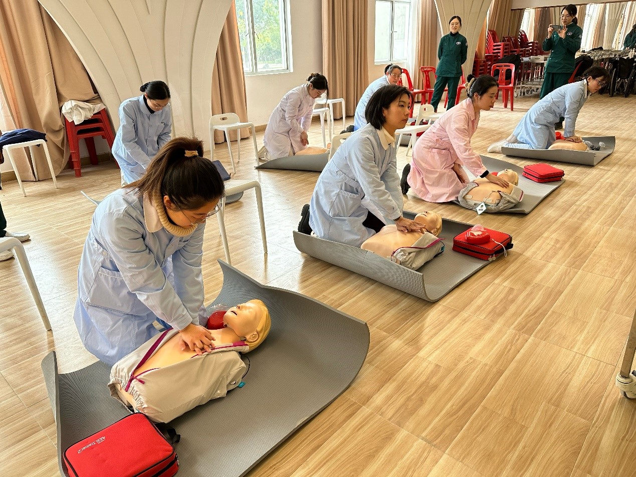 此次培訓(xùn)活動以我院美國心臟協(xié)會(AHA)培訓(xùn)中心為主導(dǎo),面向護(hù)理學(xué)院青年教師開展普及現(xiàn)場心肺復(fù)蘇急救技術(shù)的培訓(xùn)。AHA是全球心血管領(lǐng)域最權(quán)威的專業(yè)組織之一。長期致力于全球范圍內(nèi)培訓(xùn),旨在推廣心肺復(fù)蘇(CPR)技術(shù)在專業(yè)醫(yī)療救護(hù)人員與公眾的普及。導(dǎo)師們通過視頻教學(xué)、現(xiàn)場模擬、交流互動等方式,精準(zhǔn)指導(dǎo)學(xué)員領(lǐng)會每一個細(xì)節(jié)動作。參訓(xùn)人員依次有序進(jìn)行技能培訓(xùn),導(dǎo)師們手把手地教,學(xué)員一絲不茍認(rèn)真地學(xué)。最終,所有學(xué)員均通過理論和技能考試。