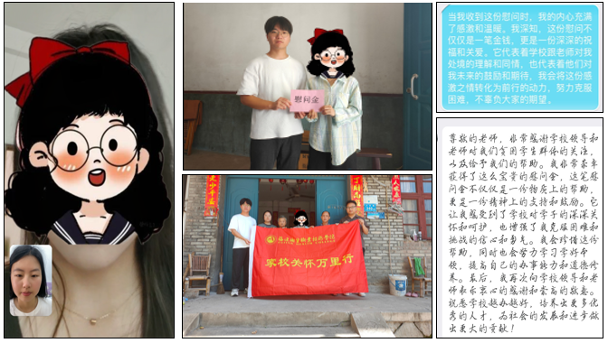 學(xué)生和家長(zhǎng)對(duì)老師們送來(lái)的慰問(wèn)品和慰問(wèn)金表示感謝,對(duì)學(xué)校長(zhǎng)期以來(lái)給予的幫助和支持表示衷心的謝意,受訪學(xué)生們紛紛送上感謝短信,表示會(huì)將困難化作前進(jìn)力量,努力提升自我,不負(fù)期望。