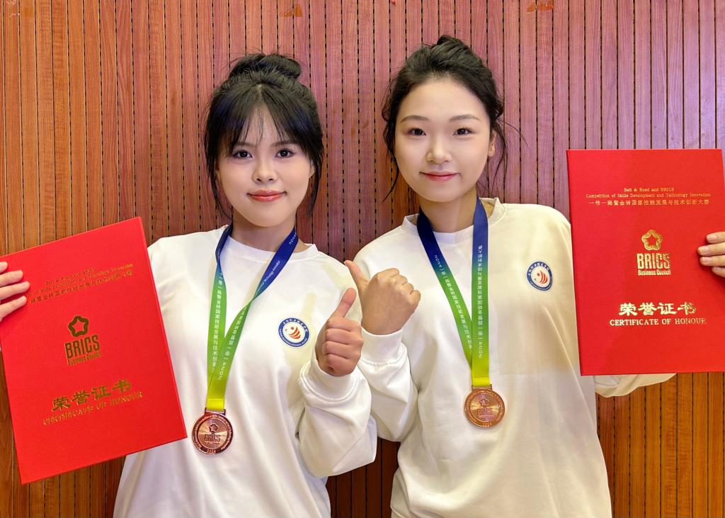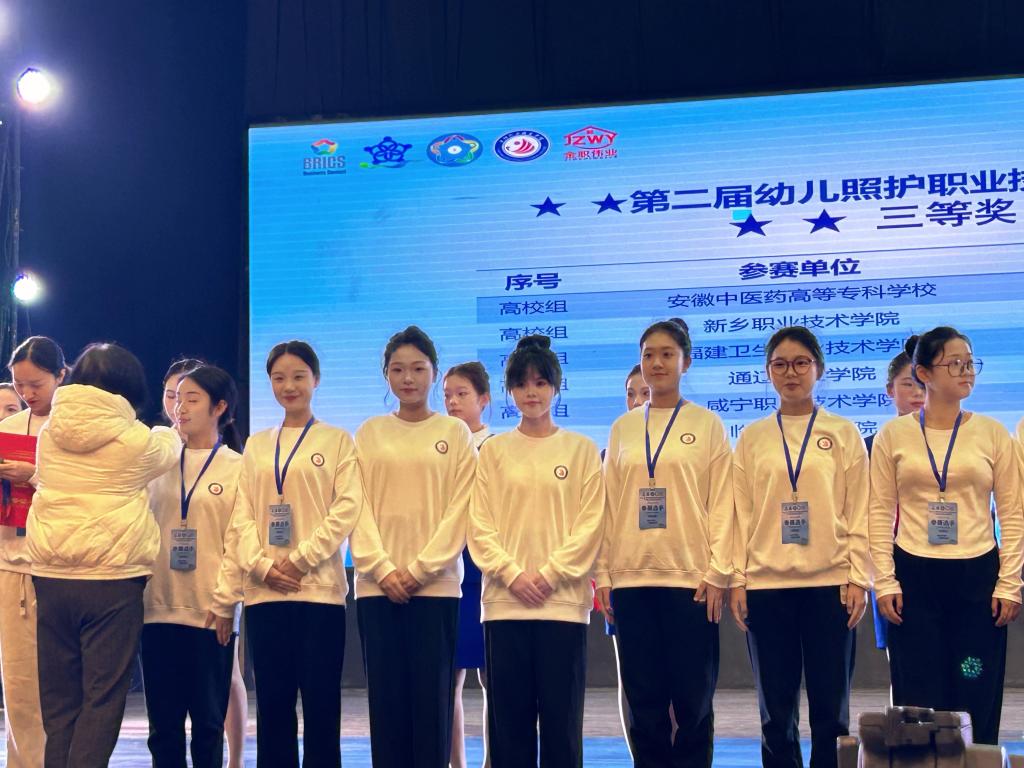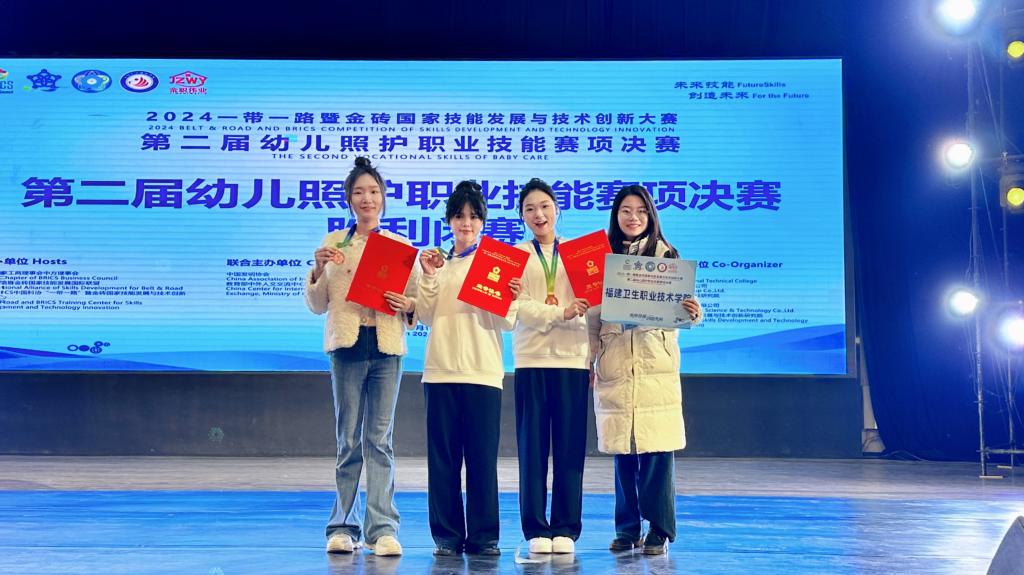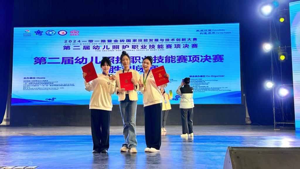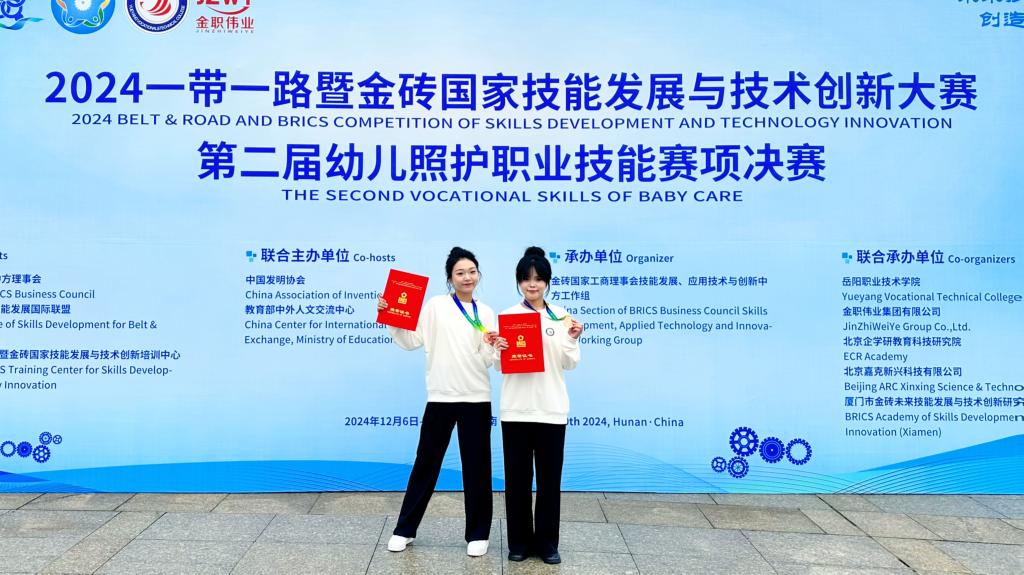 本次大賽由金磚國家工商理事會中方理事會、“一帶一路”暨金磚國家技能發(fā)展國際聯(lián)盟、中國科協(xié)“一帶一路”暨金磚國家技能發(fā)展與技術(shù)創(chuàng)新培訓(xùn)中心主辦,岳陽職業(yè)技術(shù)學(xué)院、金職偉業(yè)集團(tuán)有限公司等聯(lián)合承辦。此前,我校師生參加11月15日至17日在南昌職業(yè)大學(xué)舉辦的2024一帶一路暨金磚國家技能發(fā)展與技術(shù)創(chuàng)新大賽第二屆幼兒照護(hù)職業(yè)技能賽項(xiàng)區(qū)域選拔賽(第八場),從62支隊(duì)伍、90余名選手中脫穎而出,陳萱萱、梁安宏獲高職組團(tuán)隊(duì)二等獎,李馨老師獲教師組三等獎。