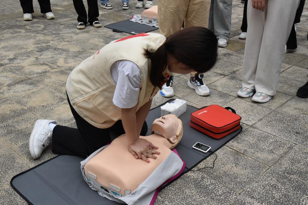護理學院第二黨支部“雙帶頭人”洪霞老師帶領黨員同志以“理論+實踐”相結合的方式為在場學生及家長們開展心肺復蘇術(CPR)與自動體外除顫器(AED)操作培訓。培訓中,洪霞老師用通俗易懂的語言和形象生動的圖片向同學們介紹了心肺復蘇急救知識,以及心肺復蘇的流程與要領。通過利用人體模型,就心肺復蘇涉及的迅速呼救、胸外按壓、開放氣道、人工呼吸、自動體外除顫器等操作步驟進行分解演練,確保動作標準、力度到位。這種手把手的教學活動既檢驗了理論知識,又加深了實踐記憶。