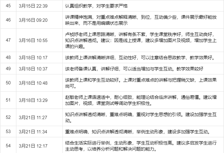 為了保障教學(xué)效果,護(hù)理學(xué)院的教學(xué)督導(dǎo)也實(shí)時(shí)跟進(jìn)。開(kāi)學(xué)以來(lái),護(hù)理學(xué)院共開(kāi)展線上督導(dǎo)56次,就線上教學(xué)情況、課堂互動(dòng)效果等進(jìn)行評(píng)價(jià),并及時(shí)向授課老師反饋,與老師們共同探討線上授課的技巧,提升教學(xué)效果。