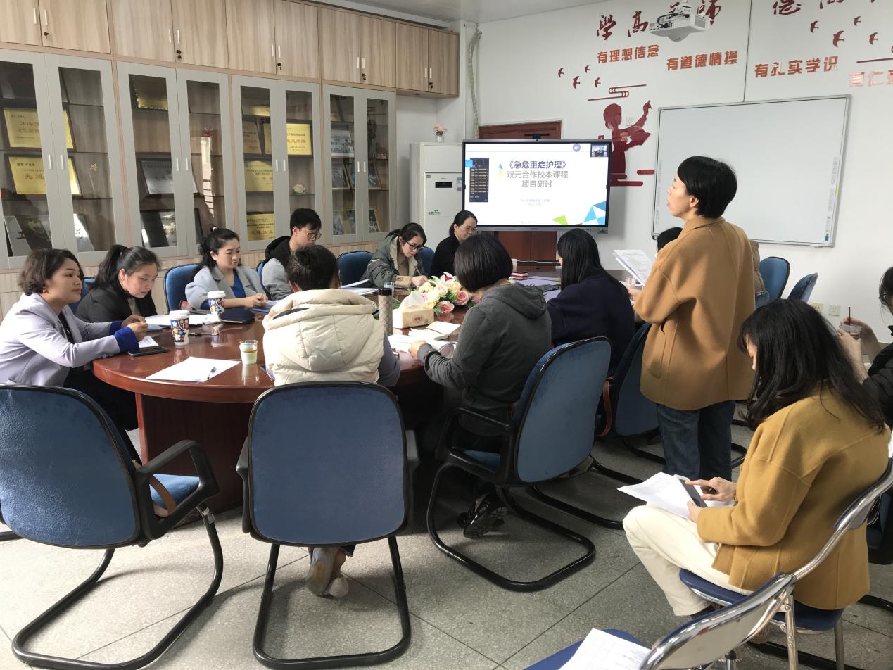 “急救護理”系列示范建設以建成校級標準、校企雙元、產(chǎn)教融合的資源共享課程、在線開放課程為目標,以進一步完善課程資源開發(fā)及校企合作雙元教材研發(fā)為重點。研討會上,護理學院第二黨支部書記兼內(nèi)科護理教研室主任洪霞、黨員教師張璟和龔仁燕分別介紹了《急危重癥護理》課程擬定開發(fā)微課設計思路、課程擬修訂教學模式、課程網(wǎng)站建設與完善思路等課程示范建設任務的實施方案以及雙元合作校本教材的設計思路、老年保健專業(yè)《基本救護技術》的進度。各醫(yī)院臨床教師熱烈討論,積極建言,引入職業(yè)技能培訓中采用的新標準、新規(guī)范、新技術,使日常教學更加貼近臨床實踐。