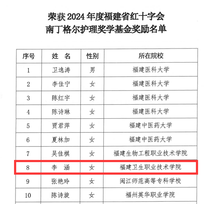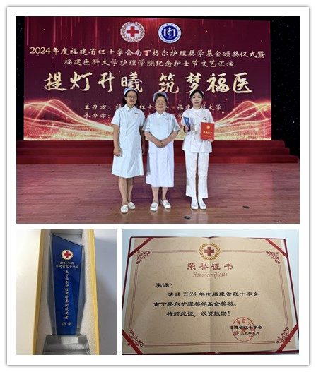 根據(jù)福建省紅十字會(huì)《關(guān)于頒發(fā)2024年度福建省紅十字會(huì)南丁格爾護(hù)理獎(jiǎng)學(xué)基金獎(jiǎng)勵(lì)的決定》通知,共有30名來(lái)自全省各醫(yī)學(xué)院校護(hù)理專業(yè)學(xué)生獲得2024年度福建省紅十字會(huì)南丁格爾護(hù)理獎(jiǎng)學(xué)基金獎(jiǎng)勵(lì)。我院21護(hù)理312班李涵同學(xué)獲此殊榮。
