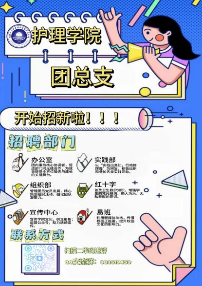 護理學(xué)院團總支期待與你們攜手并進,共創(chuàng)輝煌。若你心懷熱忱,渴望成長,就請掃描下方二維碼,加入我們這個充滿活力的大家庭吧!讓我們一起,在青春的舞臺上綻放光芒,書寫屬于我們的精彩篇章!