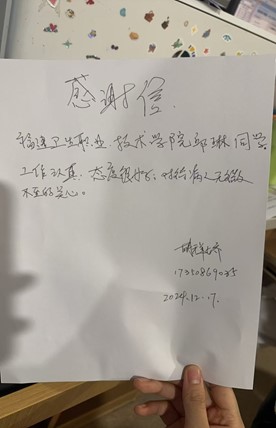 近日,護理學院22護理312班邱琳同學,在廈門大學附屬第一醫(yī)院腎內(nèi)科實習期間,收到了住院患者的親筆感謝信。科室護士長及科室老師也對邱琳同學的護理工作給予了高度認可。