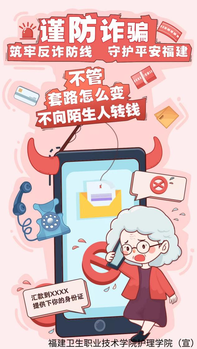 海報以“謹(jǐn)防詐騙”為核心主題,通過“筑牢反詐防線,守護(hù)平安福建”的口號,強(qiáng)調(diào)了防范詐騙對于維護(hù)社會平安的重要性?!?/span>不管套路怎么變,不向陌生人轉(zhuǎn)錢”這一口號簡潔明了,直接點出了詐騙的常見手段——誘騙受害者轉(zhuǎn)賬。同時,通過老年女性角色的驚恐表情和手機(jī)屏幕上的禁止符號,增強(qiáng)了警示效果,使得公眾能夠更容易地理解和記住防范要點。