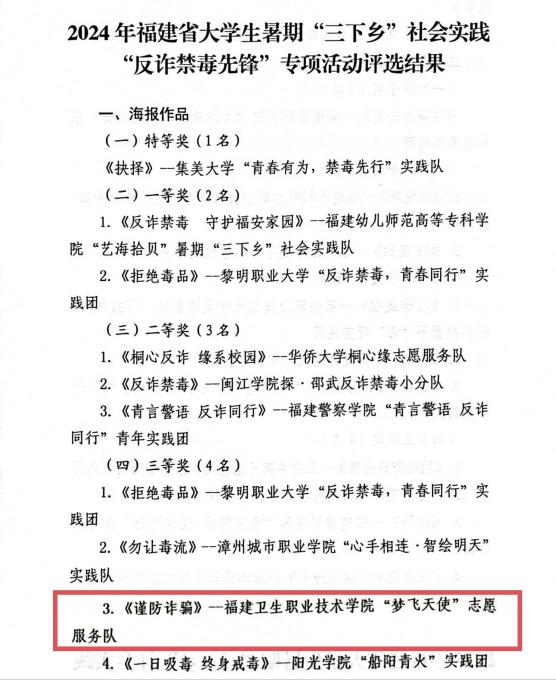 在2024年福建省大學(xué)生暑假“三下鄉(xiāng)”社會實踐“反詐禁毒先鋒”專項活動中,我院“夢飛天使”志愿服務(wù)隊?wèi){借卓越的海報作品,榮獲三等獎的佳績!