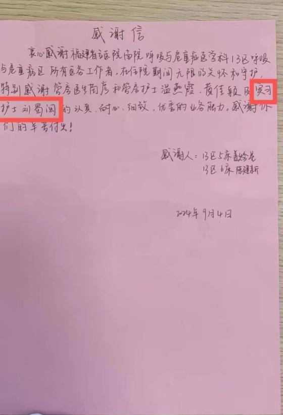 近日,護(hù)理學(xué)院22護(hù)理309班劉蜀閩同學(xué),在福建省立南院呼吸與危重癥醫(yī)學(xué)科13區(qū)呼吸與危重病區(qū)實習(xí)期間,收到了住院患者的親筆感謝信??剖易o(hù)士長及科室老師也對劉蜀閩同學(xué)護(hù)理工作給予了高度認(rèn)可。