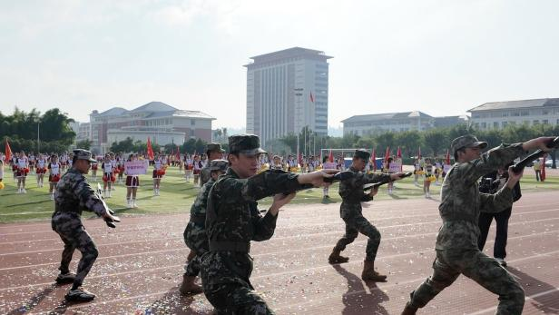 整齊劃一地表演著刺刀操,