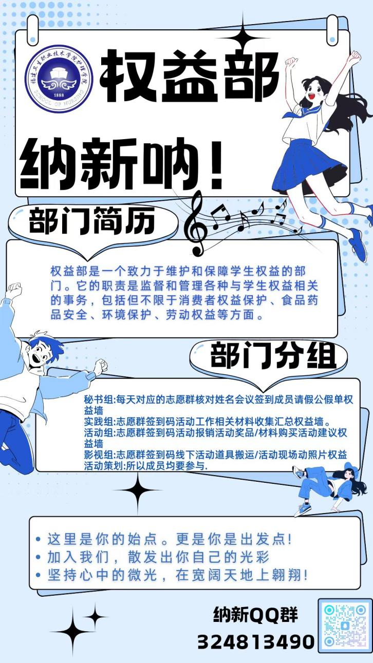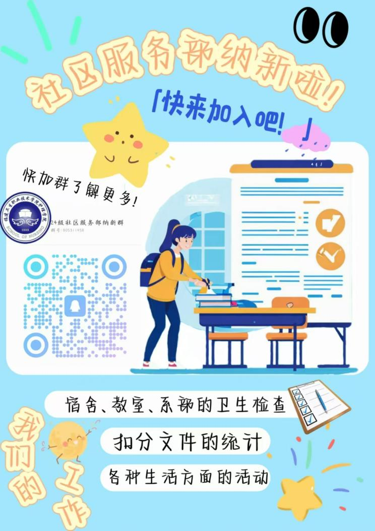 加入學(xué)生會(huì),你將擁有更多的機(jī)會(huì)參與到學(xué)校的管理和建設(shè)中,為自己的大學(xué)生活增添一抹絢麗的色彩。不要再猶豫了!加入學(xué)生會(huì)活動(dòng)多多,機(jī)會(huì)多多,各個(gè)部門覆蓋你校園學(xué)習(xí)、生活的方方面面,快來(lái)掃描二維碼加入我們納新群,多多了解我們吧!期待在9月9日晚上與你相遇!