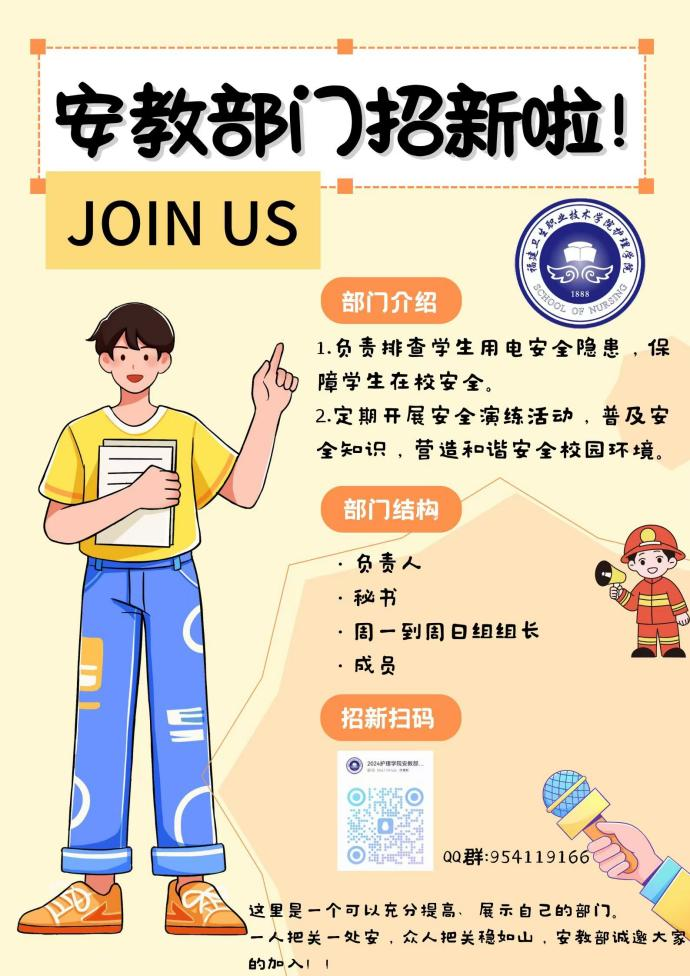 安教部是保障同學(xué)們的在校安全,提高同學(xué)們的安全意識(shí),共同創(chuàng)建美好和諧校園。聯(lián)系校部及系部組織相應(yīng)的活動(dòng)。以學(xué)院及學(xué)校創(chuàng)造一個(gè)具有較強(qiáng)安全意識(shí)環(huán)境為己任。