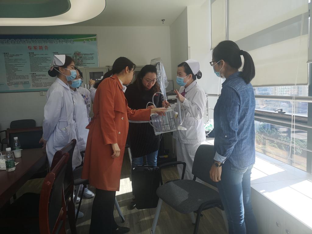 涂秀華老師還熱情地為教研室的老師們分享了她制作的教學(xué)視頻——《氣胸病人的胸腔置管術(shù)》、《胸腔閉式引流管的拔管方法》、《肺癌病人的術(shù)前術(shù)后健康宣教》,交流了肺癌患者的微創(chuàng)胸腔鏡手術(shù)治療與護(hù)理,還向老師們展示了該科室獲國家專利的多功能輸液架,使老師們更新了知識(shí),拓寬了視野。