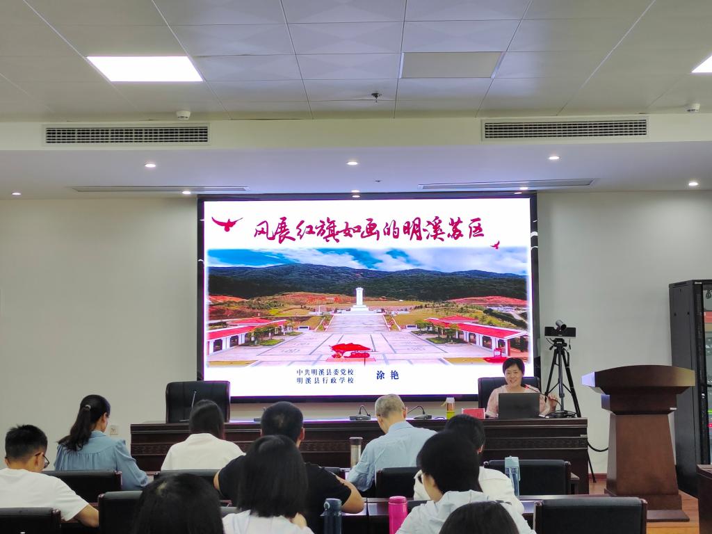 “寧化、清流、歸化,路隘林深苔滑。今日向何方,直指武夷山下。山下山下,風(fēng)展紅旗如畫?!币皇酌珴蓶|同志的《如夢令·元旦》讓馬院教師重回革命戰(zhàn)爭年代如火如荼的斗爭場景,重溫革命先烈用鮮血和生命鑄就的蘇區(qū)精神。在理論教學(xué)環(huán)節(jié)中,明溪縣委黨校高級講師涂艷為馬院教師作《風(fēng)展紅旗如畫的明溪蘇區(qū)》專題講座。她從“路隘林深苔滑——血與火的革命實踐”“風(fēng)展紅旗如畫——譜寫時代的新篇章”兩部分為教師們上了一堂生動的黨史思政課。