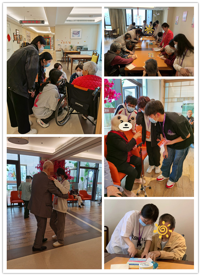 結(jié)束交流后,同學(xué)們在泰康之家工作人員的帶領(lǐng)下,分組進(jìn)入園區(qū)的護(hù)理公寓,在園區(qū)護(hù)理師團(tuán)隊(duì)老師的指導(dǎo)下,一同參與到在園區(qū)生活的長者們的文體活動(dòng)中,與長者們一起完成一個(gè)小游戲、一幅畫、一首舞曲,并送上對(duì)長者們的祝福。
