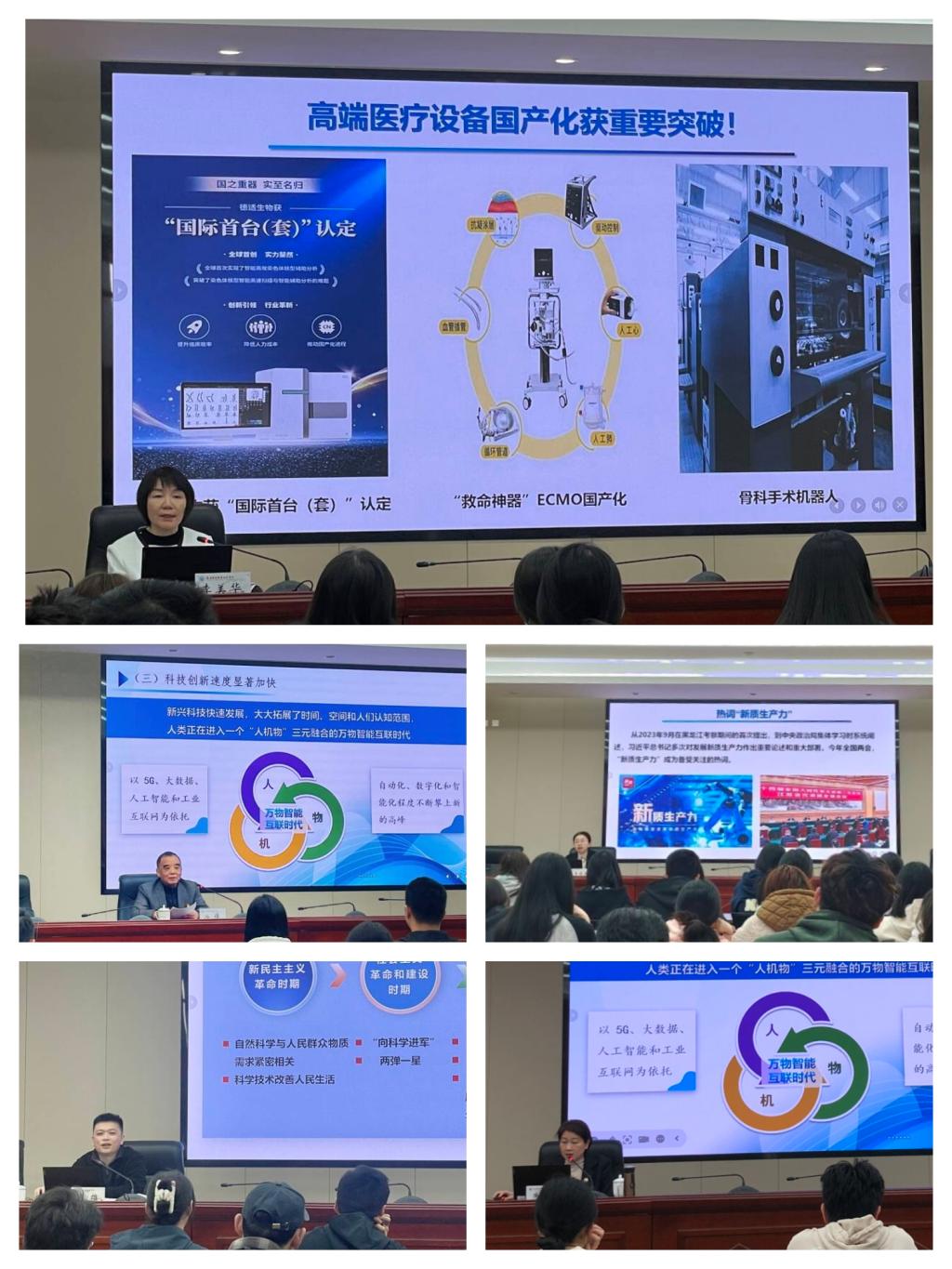 李美華、游鋒、黃銘珊、周雄、朱扶蓉向廣大師生講述了中國(guó)共產(chǎn)黨執(zhí)政以來(lái),科技創(chuàng)新與人民生命健康緊密結(jié)合所形成的豐富的科技思想成就和科技創(chuàng)新成果,指出我校正銳意進(jìn)取、改革創(chuàng)新,不斷擘畫(huà)學(xué)校高質(zhì)量發(fā)展藍(lán)圖,為健康中國(guó)戰(zhàn)略貢獻(xiàn)職教力量。通過(guò)他們的宣講,廣大師生受益匪淺,深刻領(lǐng)會(huì)百年變局之下,科技創(chuàng)新是“關(guān)鍵變量”,也是高質(zhì)量發(fā)展的“最大增量”,紛紛表示將秉承“業(yè)精德誠(chéng)”校訓(xùn),勇創(chuàng)新風(fēng)績(jī),再續(xù)輝煌,以?shī)^斗者的最美姿態(tài)為新中國(guó)成立75周年獻(xiàn)禮。