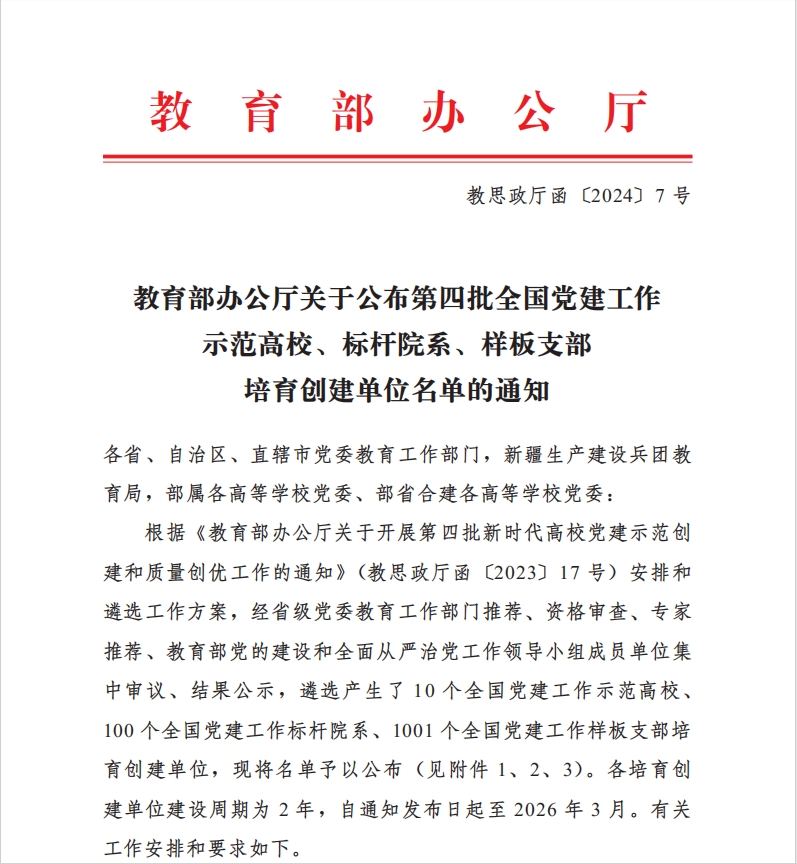 近日,教育部辦公廳公布第四批全國黨建工作示范高校、標(biāo)桿院系、樣板支部培育創(chuàng)建單位名單,經(jīng)省級黨委教育工作部門推薦、資格審查、專家推薦、教育部黨的建設(shè)和全面從嚴(yán)治黨工作領(lǐng)導(dǎo)小組成員單位集中審議、結(jié)果公示,遴選產(chǎn)生了10個全國黨建工作示范高校、100 個全國黨建工作標(biāo)桿院系、1001個全國黨建工作樣板支部培育創(chuàng)建單位。