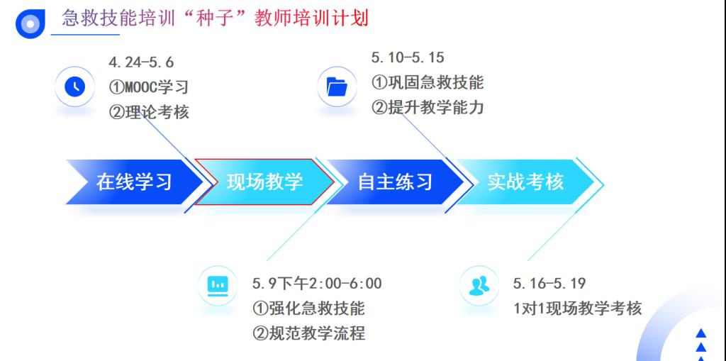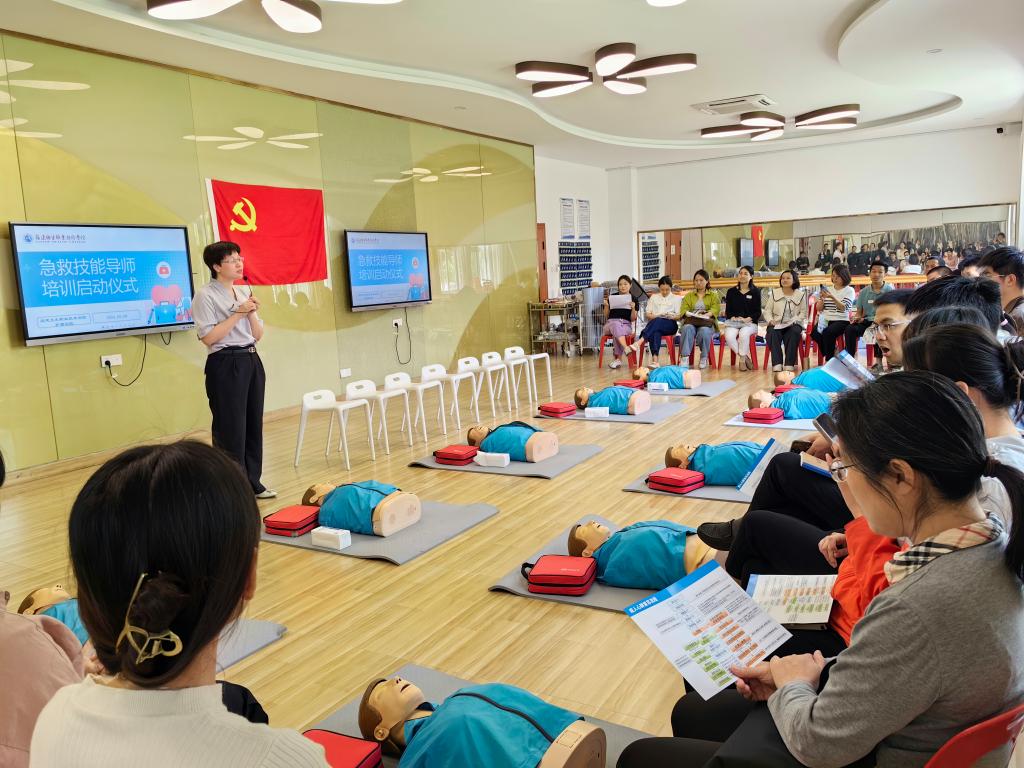 本次培訓分為在線學習、現(xiàn)場教學、自主學習、實戰(zhàn)考核等幾個階段,31名“種子”教師將接受成人心肺復蘇術(CPR)和自動體外除顫儀(AED)技能培訓。