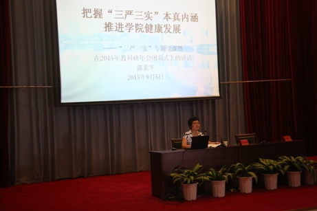 郭素華院長(zhǎng)就“把握‘三嚴(yán)三實(shí)’本真內(nèi)涵 推進(jìn)學(xué)院健康發(fā)展”給大家上了一堂主題黨課,并就學(xué)院新學(xué)期工作進(jìn)行了部署。郭院長(zhǎng)引用《左傳》、《資治通鑒》等歷史典故深入淺出地闡釋了“三嚴(yán)三實(shí)”的豐富內(nèi)涵,要求廣大黨員干部要向習(xí)近平總書記提出的新時(shí)期好干部標(biāo)準(zhǔn)看齊;郭院長(zhǎng)指出,當(dāng)前在一些領(lǐng)導(dǎo)干部身上還不同程度存在“十個(gè)方面”和“八缺八不缺”等問(wèn)題,郭院長(zhǎng)勸勉全體黨員干部要對(duì)照問(wèn)題清單,從嚴(yán)要求,時(shí)刻自重自省自警自勵(lì)。郭院長(zhǎng)強(qiáng)調(diào),“三嚴(yán)三實(shí)”學(xué)習(xí)教育要與學(xué)院新學(xué)期的工作緊密結(jié)合,要全面落實(shí)《學(xué)院省級(jí)示范性高職院校建設(shè)方案》和《學(xué)院省級(jí)示范性高職院校建設(shè)任務(wù)書》確定的各項(xiàng)任務(wù),圍繞省級(jí)示范性高職院校項(xiàng)目驗(yàn)收和第二輪高職院校人才培養(yǎng)工作評(píng)估,扎實(shí)推進(jìn)各項(xiàng)建設(shè)。