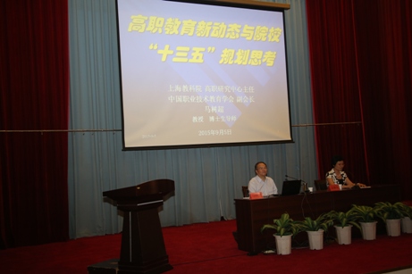 研討會(huì)特別邀請(qǐng)了中國(guó)職業(yè)技術(shù)教育學(xué)會(huì)副會(huì)長(zhǎng)、高職教育發(fā)展研究中心主任馬樹超教授來(lái)校作“高職教育新動(dòng)態(tài)和院?!濉?guī)劃思考”專題講座。馬樹超教授的講座從新常態(tài)思路下高職教育新動(dòng)態(tài)、現(xiàn)代職業(yè)教育新定位、高職發(fā)展環(huán)境特征與改革發(fā)展策略思考等三個(gè)部分展開,在把握“十三五”發(fā)展環(huán)境與階段特征的基礎(chǔ)上確立“十三五”發(fā)展目標(biāo)和總體思路,強(qiáng)調(diào)面對(duì)“互聯(lián)網(wǎng)+”的新常態(tài),高職院校要加快智慧校園和數(shù)字教學(xué)資源建設(shè),完善信息化教學(xué)基礎(chǔ)設(shè)施、深化在線信息技術(shù)環(huán)境下工學(xué)結(jié)合教與學(xué)模式改革。