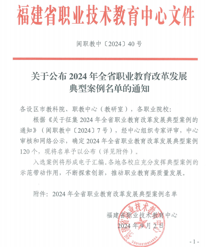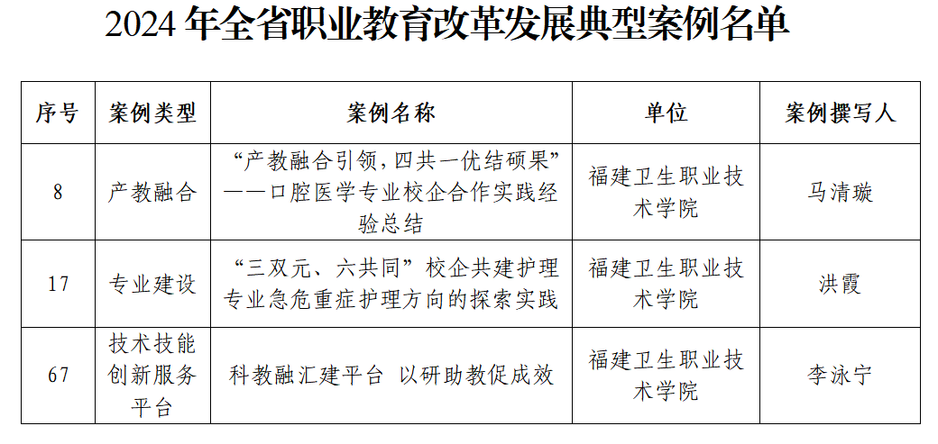 近日,福建省職業(yè)技術(shù)教育中心公布了2024年全省職業(yè)教育改革發(fā)展典型案例名單,我校報送的《“產(chǎn)教融合引領(lǐng),四共一優(yōu)結(jié)碩果”——口腔醫(yī)學(xué)專業(yè)校企合作實踐經(jīng)驗總結(jié)》(醫(yī)學(xué)院)、《“三雙元、六共同”校企共建護理專業(yè)急危重癥護理方向的探索實踐》(護理學(xué)院)、《科教融匯建平臺 以研助教促成效》(藥學(xué)院)三個案例分別入選“產(chǎn)教融合”“專業(yè)建設(shè)”“技術(shù)技能創(chuàng)新服務(wù)平臺”類型典型案例。