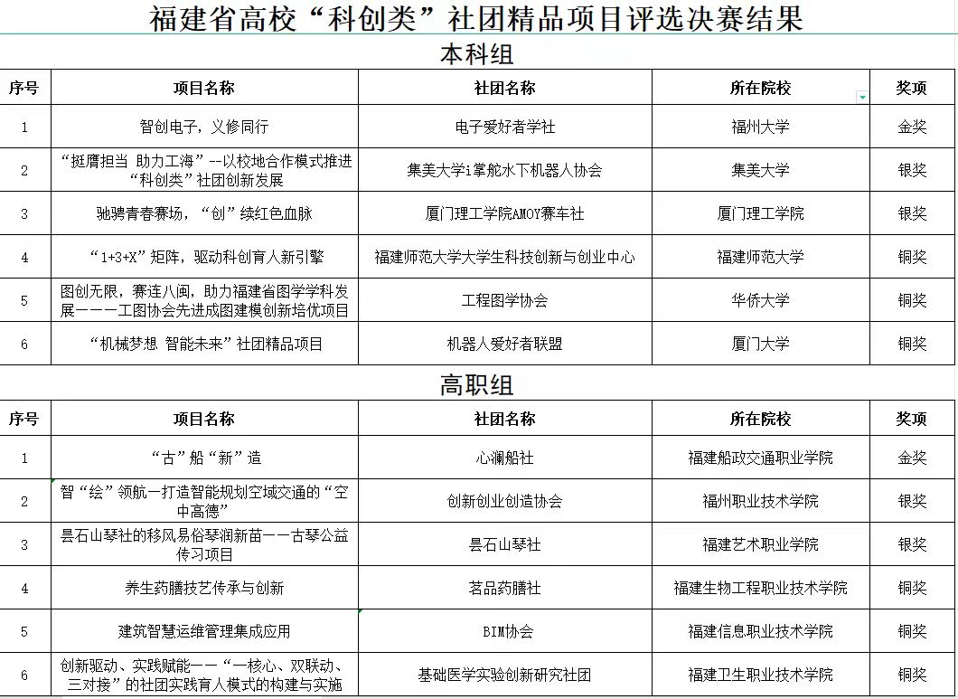 全省高職院校共有30組項(xiàng)目進(jìn)入決賽,決賽形式為現(xiàn)場(chǎng)答辯,分為PPT工作匯報(bào)和評(píng)審提問(wèn),由專業(yè)評(píng)審團(tuán)對(duì)各個(gè)社團(tuán)項(xiàng)目答辯進(jìn)行評(píng)分,最終評(píng)選出金獎(jiǎng)1項(xiàng)、銀獎(jiǎng)2項(xiàng)、銅獎(jiǎng)3項(xiàng)。我校鄧元榮、林玉瓊老師指導(dǎo)的“基礎(chǔ)醫(yī)學(xué)實(shí)驗(yàn)創(chuàng)新研究社團(tuán)”獲得銅獎(jiǎng),鐘偉雄老師指導(dǎo)的“電子協(xié)會(huì)”獲得優(yōu)秀獎(jiǎng)。