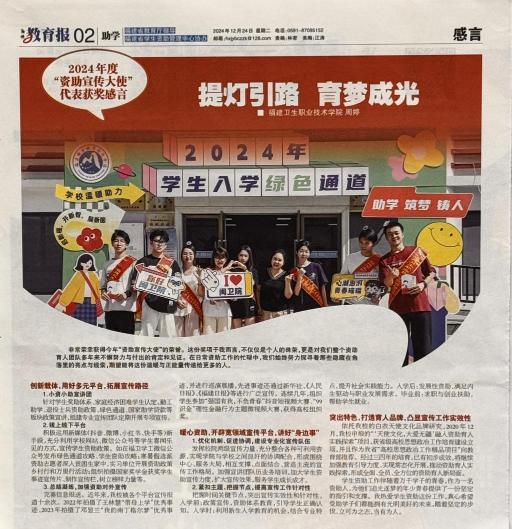 學(xué)生工作部周婷以“資助宣傳大使”的身份,在海峽教育報(bào)分享《提燈引路,育夢(mèng)成光》工作感言。