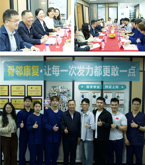 曾武祈帶領(lǐng)團隊考察2015屆康復治療技術(shù)專業(yè)校友沈鵬楠創(chuàng)辦的骨鄰運動康復中心,深入了解企業(yè)運營模式、行業(yè)趨勢及人才需求。座談會現(xiàn)場,9位畢業(yè)生校友齊聚一堂,濃濃的師生情誼與合作熱情交織,讓領(lǐng)導老師們倍感欣慰。座談會上,雙方就人才培養(yǎng)、實習實訓、就業(yè)創(chuàng)業(yè)等領(lǐng)域深入交流,初步達成建立長期合作關(guān)系的共識。企業(yè)承諾為學生實習就業(yè)提供優(yōu)先通道,構(gòu)建互利共贏平臺;學校表示將加強交流,推動產(chǎn)學研融合,培養(yǎng)更多高素質(zhì)人才。