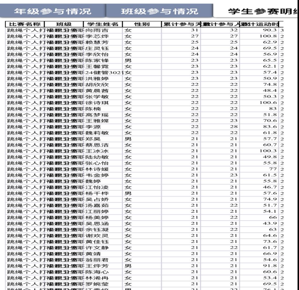 本次比賽內(nèi)容為每天在“天天跳繩”進(jìn)行打卡,每次跳繩300個(gè)即打卡成功,活動(dòng)期間內(nèi)打卡21天即為成績(jī)有效。校團(tuán)委社團(tuán)部跳繩協(xié)會(huì)對(duì)同學(xué)們的每日跳繩進(jìn)行監(jiān)督,各院學(xué)生利用業(yè)余時(shí)間主動(dòng)參與。此次比賽不僅展示了同學(xué)們堅(jiān)持不懈的體育精神,也增強(qiáng)了同學(xué)們的體質(zhì),愉悅了大家的身心,讓廣大同學(xué)對(duì)跳繩運(yùn)動(dòng)的內(nèi)涵有了更深入的理解。