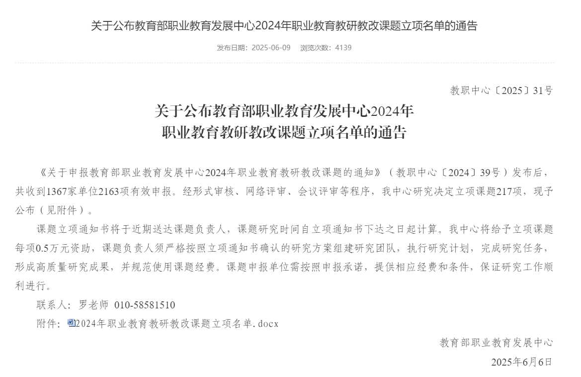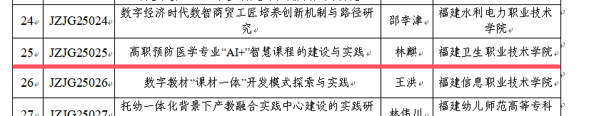 近日,教育部職業(yè)教育發(fā)展中心正式公布2024年職業(yè)教育教研教改課題立項名單。我校預防醫(yī)學專業(yè)帶頭人林麒老師申報的《高職預防醫(yī)學專業(yè)“AI +”智慧課程的建設與實踐》課題成功獲批立項,為學校教育教學改革再添新成果。