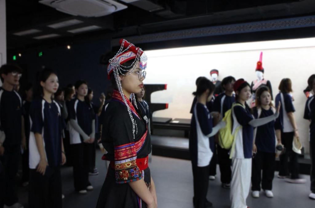 實(shí)踐隊(duì)先來到畬族文化中心參觀,隊(duì)伍中一位畬族隊(duì)員特意換上了本民族的傳統(tǒng)服飾:黑色的衣料上點(diǎn)綴著鮮亮的彩色刺繡,或是靈動的花鳥圖案,或是寓意吉祥的傳統(tǒng)紋樣,在館內(nèi)柔和的光線中顯得格外雅致。作為畬族兒女,她看著館內(nèi)陳列的畬族文物、圖文資料時,眼中滿是親切與認(rèn)同,靜靜駐足的身影與周圍的文化展品相映,仿佛是民族文化傳承的一個生動縮影,也為之后走進(jìn)民族中學(xué),與各族學(xué)生交流埋下了共鳴的伏筆。