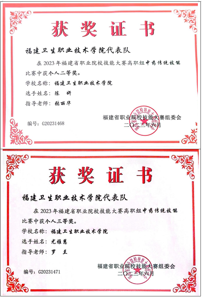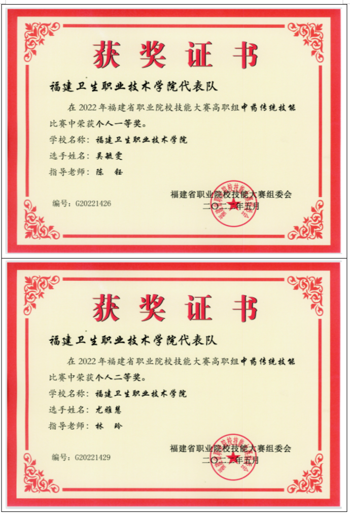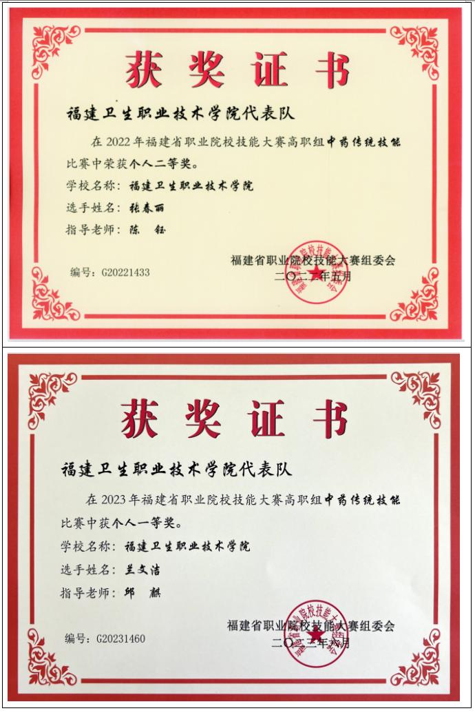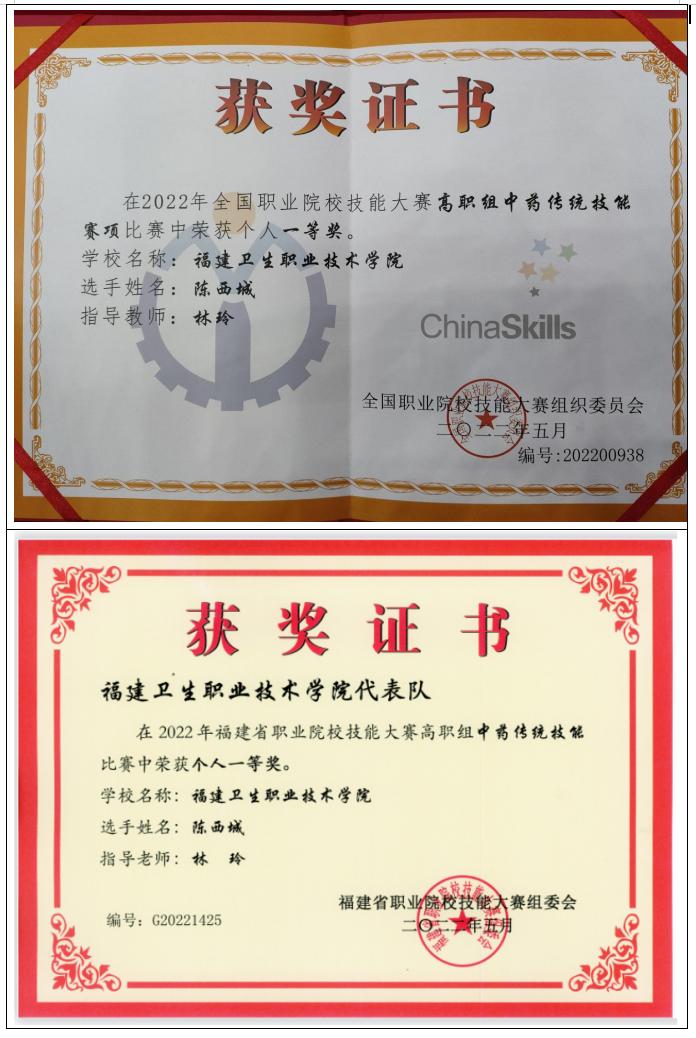 中藥學(xué)專(zhuān)業(yè)學(xué)生榮獲2022年全國(guó)職業(yè)院校技能大賽高職組中藥傳統(tǒng)技能賽項(xiàng)比賽中榮獲個(gè)人一等獎(jiǎng) |