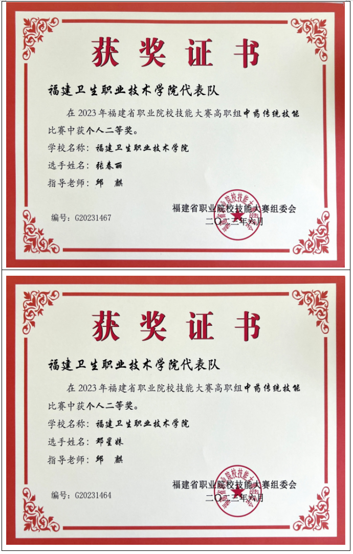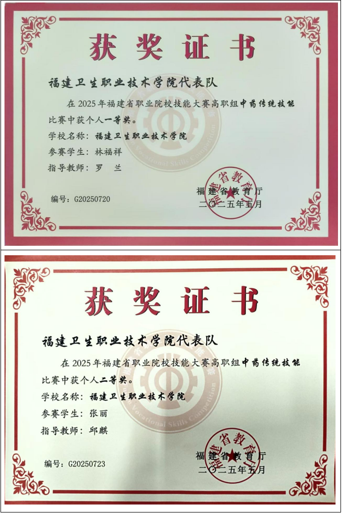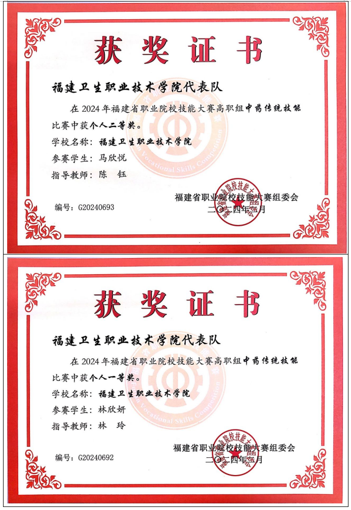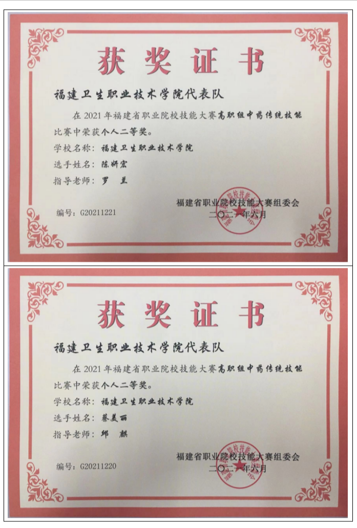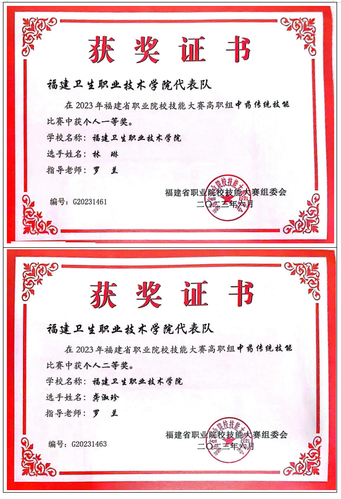中藥學(xué)專(zhuān)業(yè)學(xué)生榮獲2022年全國(guó)職業(yè)院校技能大賽高職組中藥傳統(tǒng)技能賽項(xiàng)比賽中榮獲個(gè)人一等獎(jiǎng) |
