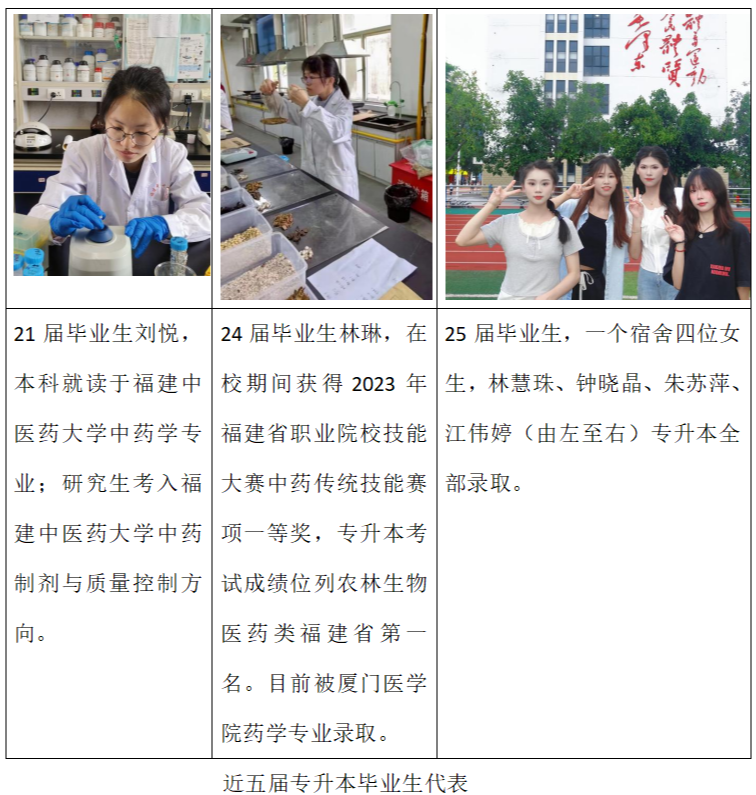 升學(xué)率:已培養(yǎng)12屆畢業(yè)生,2020~2024年應(yīng)屆畢業(yè)生參加專(zhuān)升本考試錄取率達(dá)15%以上。2025年中藥學(xué)專(zhuān)業(yè)學(xué)生被本科高校錄取人數(shù)30名,占比20%以上。