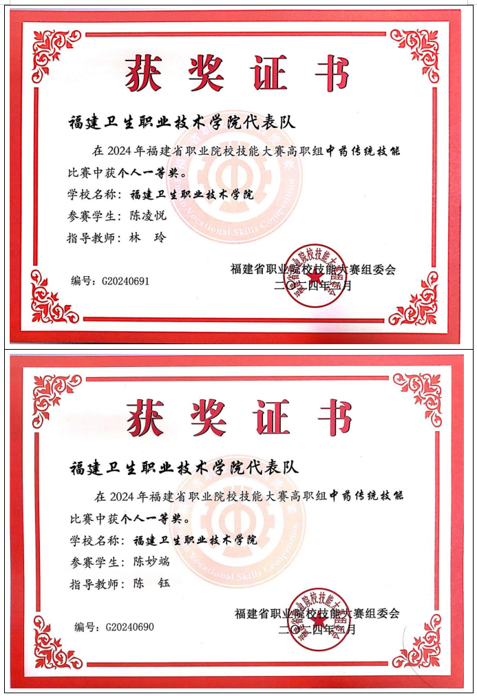 2012年起,專(zhuān)業(yè)教師指導(dǎo)學(xué)生參加中藥傳統(tǒng)技能競(jìng)賽共計(jì)獲得全國(guó)一等獎(jiǎng)2項(xiàng),二等獎(jiǎng)4項(xiàng),三等獎(jiǎng) 2項(xiàng);省級(jí)一等獎(jiǎng)10項(xiàng),二等獎(jiǎng)16項(xiàng),三等獎(jiǎng)13項(xiàng)。