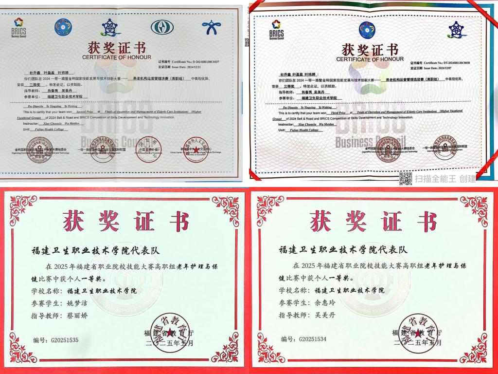 近年,學(xué)生參加養(yǎng)老專業(yè)技能大賽,榮獲省賽一等獎2項、“一帶一路”暨金磚國家技能發(fā)展與技術(shù)創(chuàng)新大賽區(qū)域賽團(tuán)體三等獎1項、決賽團(tuán)體二等獎1項。