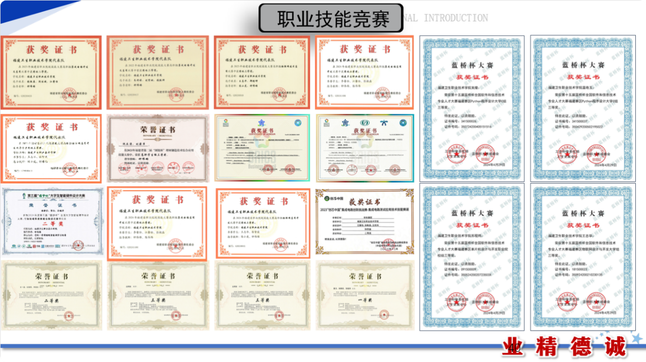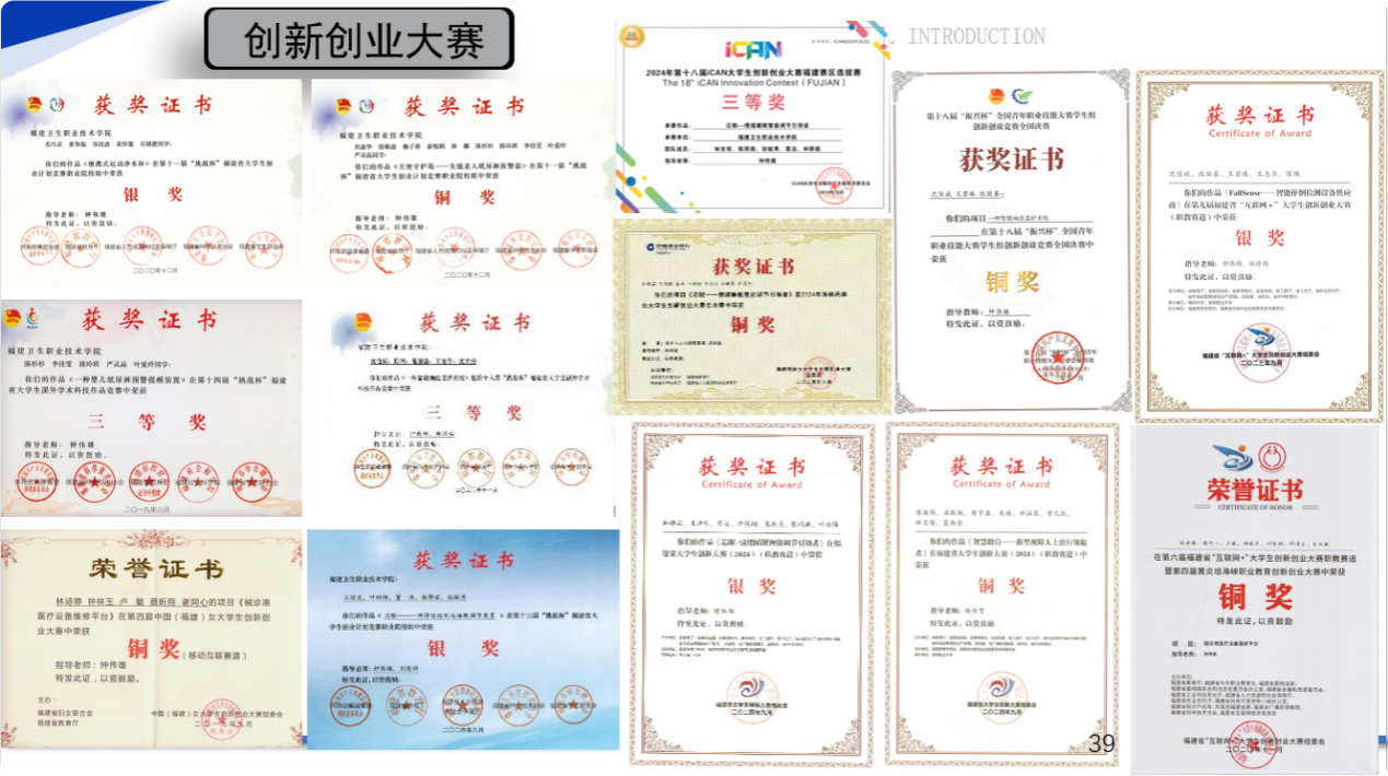 學生獲得全國醫(yī)用電子儀器技術(shù)職業(yè)技能大賽個人二等獎1項、個人三等獎1項、團體三等獎2項,2022-2023“一帶一路”暨金磚國家技能發(fā)展與技術(shù)創(chuàng)新大賽一等獎和最佳組織獎1項,第十八屆“振興杯”全國青年職業(yè)技能大賽學生組創(chuàng)新創(chuàng)效競賽全國決賽銅獎1項,福建省職業(yè)院校技能大賽集成電路開發(fā)及應(yīng)用賽項二等獎3項、三等獎1項,福建省職業(yè)院校技能大賽物聯(lián)網(wǎng)技術(shù)應(yīng)用賽項三等獎2項、福建省職業(yè)院校技能大賽智能電子產(chǎn)品設(shè)計與開發(fā)賽項二等獎1項、福建省第二屆國銳杯增材制造技術(shù)綜合應(yīng)用技能大賽三等獎1項,“挑戰(zhàn)杯”福建省大學生課外學術(shù)作品競賽三等獎2項,“挑戰(zhàn)杯”福建省大學生創(chuàng)業(yè)計劃競賽銀獎2項、銅獎1項,福建省“互聯(lián)網(wǎng)+”大學生創(chuàng)新創(chuàng)業(yè)大賽銀獎1項、銅獎1項,中國(福建)女大學生創(chuàng)新創(chuàng)業(yè)大賽銅獎1項、福建省大學城創(chuàng)新大賽(2024)銀獎1項、銅獎1項,2022一帶一路暨金磚國家技能發(fā)展與技術(shù)創(chuàng)新大賽浙區(qū)域賽二等獎、海峽兩岸大學生職業(yè)技能大賽物聯(lián)網(wǎng)技術(shù)應(yīng)用賽項三等獎2項、智能硬件開發(fā)與應(yīng)用一等獎1項、二等獎1項。碼蹄杯全國大學生程序設(shè)計大賽職業(yè)院校賽道省賽金獎1項、銅獎4項、第十五屆藍橋杯全國軟件和信息技術(shù)專業(yè)人才大賽福建賽區(qū)Python程序設(shè)計三等獎2項、物聯(lián)網(wǎng)設(shè)計與開發(fā)大學組三等獎1項、單片機設(shè)計與開發(fā)職業(yè)院校組三等獎1項。學生參與教師科研,獲國家專利2項,國家計算機軟件著作權(quán)證書4項。