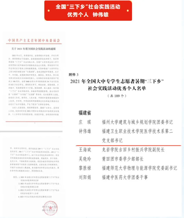 專業(yè)教師2021年研發(fā)“一種便攜式超聲診斷儀”申報國家發(fā)明專利(專利號:202010734371.8),組建“醫(yī)+紅夢隊”學生團隊,參加2021年暑期“三下鄉(xiāng)”社會實踐活動,深入福建三明尤溪,為村民帶去義診關(guān)愛。