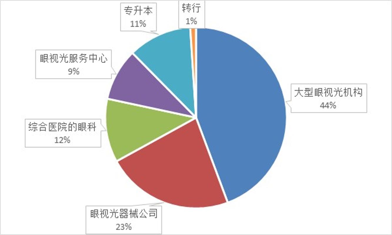 畢業(yè)生的主要去向是大型眼視光機構(gòu)的驗光崗和眼視光器械公司的技術(shù)培訓(xùn)崗,其中就業(yè)前二位的機構(gòu)是愛爾眼科醫(yī)院集團(tuán)股份有限公司、華廈眼科醫(yī)院集團(tuán)。