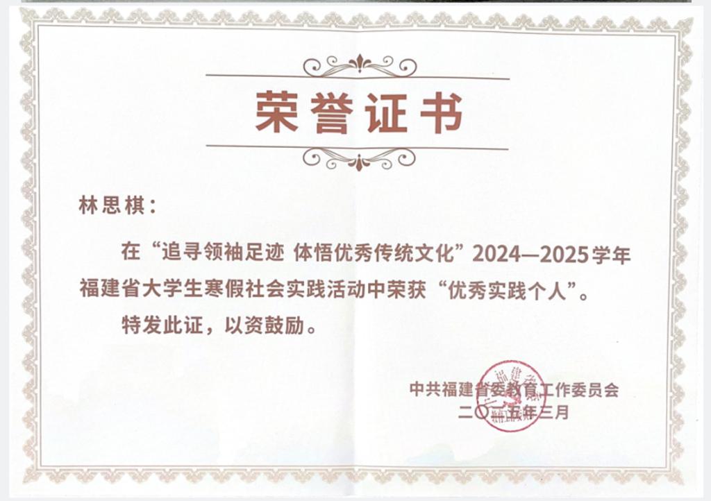 學(xué)生獲福建省大學(xué)生寒假社會(huì)實(shí)踐活動(dòng)“優(yōu)秀實(shí)踐個(gè)人”
