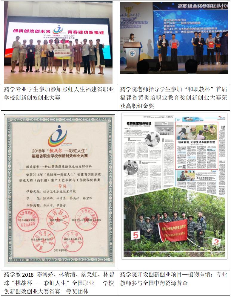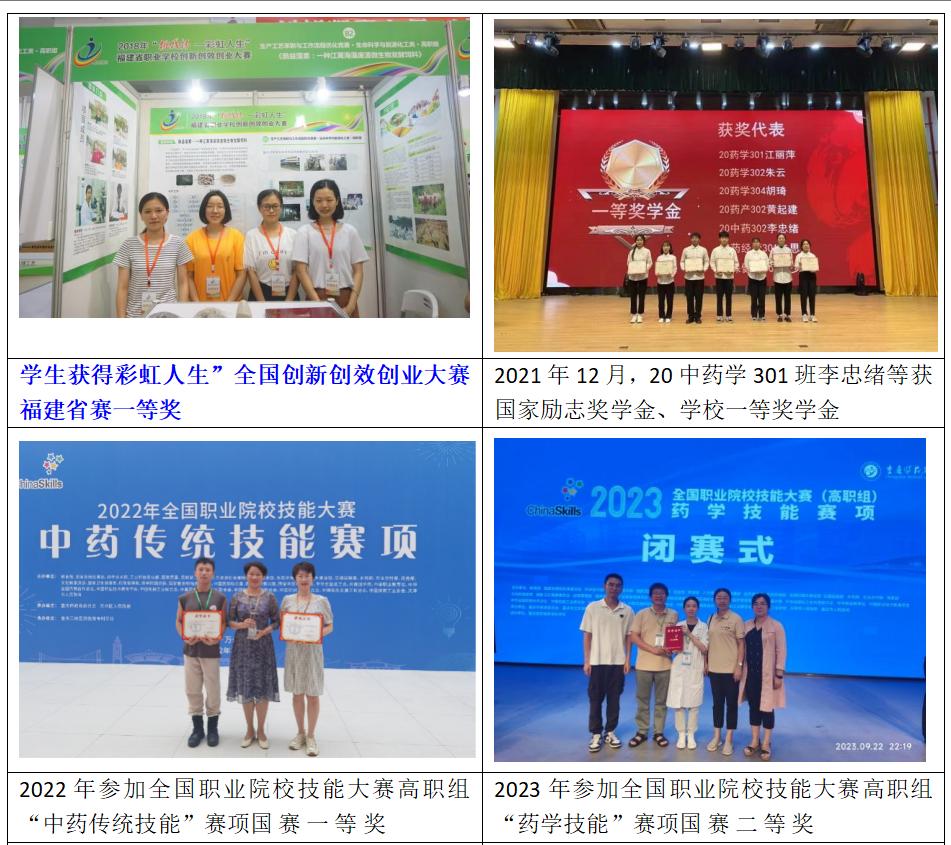 藥學(xué)院高度重視學(xué)生綜合素質(zhì)、應(yīng)用創(chuàng)新能力的培養(yǎng),設(shè)立“本草社”“膳飲工坊”“植物醫(yī)館”等學(xué)生專(zhuān)業(yè)社團(tuán),近5年學(xué)生共獲得全國(guó)及福建省高等職業(yè)院校技能大賽獎(jiǎng)項(xiàng)55項(xiàng),其中國(guó)家級(jí)6項(xiàng),省賽一等獎(jiǎng)10項(xiàng)。參加全國(guó)及福建省創(chuàng)新創(chuàng)業(yè)大賽獲得獎(jiǎng)項(xiàng)10項(xiàng),其中獲得國(guó)家級(jí)創(chuàng)新創(chuàng)業(yè)大賽二等獎(jiǎng)1項(xiàng),省級(jí)創(chuàng)新創(chuàng)業(yè)大賽一等獎(jiǎng)2項(xiàng)、三等獎(jiǎng)7項(xiàng)。近三屆畢業(yè)生就業(yè)率均在98%以上,專(zhuān)業(yè)對(duì)口率高,就業(yè)質(zhì)量逐年提升。