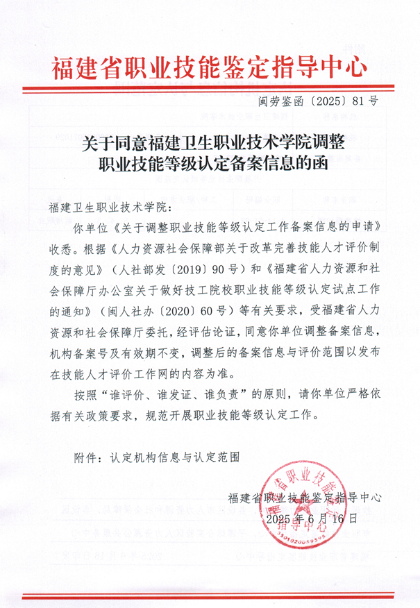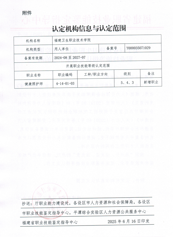 近日,我校成功通過福建省職業(yè)技能鑒定指導(dǎo)中心的嚴(yán)格審核并獲批備案,正式新增“健康照護師”職業(yè)技能等級認(rèn)定資質(zhì)。標(biāo)志著我校在職業(yè)技能人才培養(yǎng)領(lǐng)域邁出了重要一步,今后可向本校相關(guān)專業(yè)學(xué)生提供專業(yè)的健康照護師技能等級評價服務(wù)。