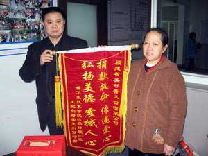 1月18日下午王配劍母親在檢驗影像系馬清璇老師、傅衍達老師的陪同下前往美可普義齒制作有限公司,公司負責人將捐款交于王配劍母親手中。王配劍母親將感激之情述于錦旗之上,表示十分感謝社會愛心人士,有這么多的愛心支撐,王配劍有信心戰(zhàn)勝病魔,創(chuàng)造生命的奇跡!王配劍的母親親手將銹有“捐款救命傳達愛心 弘揚美德震撼人心”的錦旗交到美可普義齒制作有限公司領導的手中。(檢驗影像系)