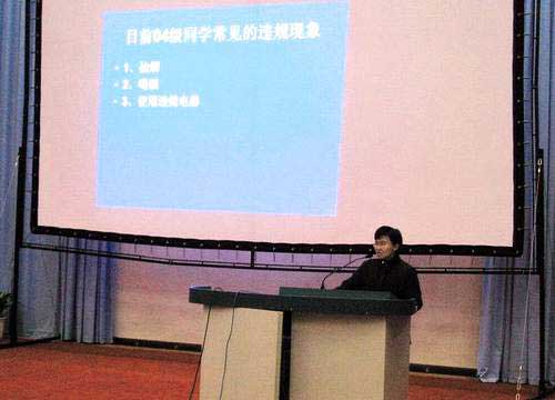 首先,劉登蕉主任從“大專生和中專生培養(yǎng)目標(biāo)的區(qū)別”、“中專生存在的主要問(wèn)題”、“大專生身心素質(zhì)的要求”及“如何成為一名合格的大學(xué)生”四個(gè)方面,對(duì)由中專升入大專的04級(jí)學(xué)生提出了新的要求和期望,旨在培養(yǎng)符合社會(huì)需要的合格的護(hù)理人才。接著,謝濤書記以“紀(jì)律教育”為主題,從04級(jí)目前的紀(jì)律狀況、大專生的違紀(jì)處罰情況、違紀(jì)與實(shí)習(xí)和畢業(yè)間的利害關(guān)系等幾方面闡述了作為一名在校大學(xué)生遵紀(jì)守規(guī)的重要性,以保障學(xué)生身心的健康發(fā)展,為成為一名合格的大學(xué)生,乃至一名合格的白衣天使打下堅(jiān)實(shí)的基礎(chǔ)。(護(hù)理系)