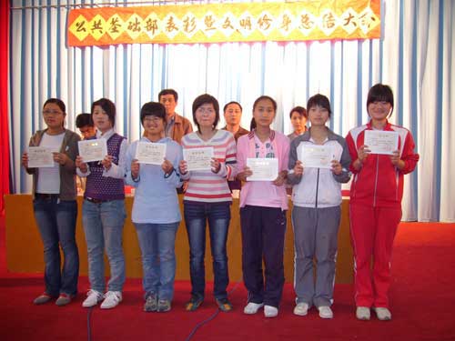 大會在雄壯的國歌聲中拉開了序幕,陳潔老師首先宣讀2006-2007學(xué)年第一學(xué)期衛(wèi)生模范宿舍、先進(jìn)個人表彰決定,上學(xué)期我部共評出6個衛(wèi)生模范宿舍和129名先進(jìn)個人。隨后進(jìn)行頒獎儀式,受表彰的衛(wèi)生模范宿舍和先進(jìn)個人代表上臺領(lǐng)獎,06級涉外護(hù)理501班謝慧林同學(xué)與5404宿舍舍長陳潔玉同學(xué)作為先進(jìn)個人與衛(wèi)生模范宿舍代表分別發(fā)言。洪聿榮書記在接下來的講話中希望我系廣大同學(xué)要珍惜榮譽(yù)、志存高遠(yuǎn)、勤奮好學(xué),不斷提高自身的綜合素質(zhì),同時,他對前階段開展的“文明修身”系列活動進(jìn)行了系統(tǒng)總結(jié),號召廣大同學(xué)持之以恒,養(yǎng)成良好行為習(xí)慣,用文明譜寫青春之歌,讓青春與文明同行。最后,學(xué)工處鄭力宏處長在講話中向受到表彰的衛(wèi)生模范宿舍與先進(jìn)個人表示祝賀,對我系開展的“文明修身”系列活動給予了充分的肯定,并勉勵廣大同學(xué)不斷努力,爭取更大進(jìn)步!