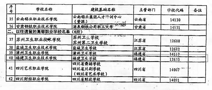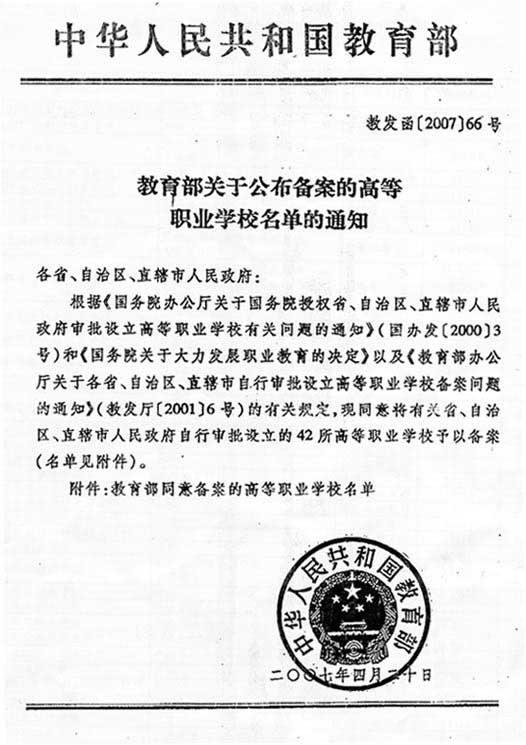 教育部于2007年4月20日下發(fā)《關(guān)于公布備案的高等職業(yè)學(xué)校名單的通知》(教發(fā)函〔2007〕66號),同意將我校予以備案,學(xué)校名稱:福建衛(wèi)生職業(yè)技術(shù)學(xué)院,學(xué)校代碼:12633。 辦公室