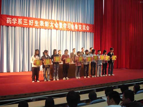 2007年 4月 10 日,我系于圖書館學(xué)術(shù)廳召開 2006~2007學(xué)年第一學(xué)期三好生表彰大會暨學(xué)習(xí)經(jīng)驗交流會,學(xué)工處處長鄭力宏,藥學(xué)系書記歐春木,藥學(xué)系主任陳穗和藥學(xué)系秘書艾松軍出席了大會,大會由艾松軍主持。